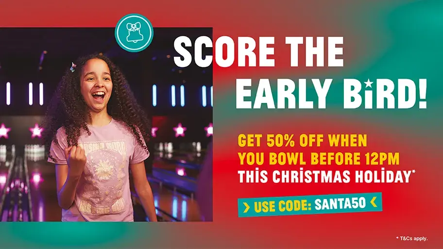 Just pop in code SANTA50 at checkout and let the merry moments roll. This 50% offer applies to standard bowling games (Adult, Kids and Family, one or two games) booked before 12.00pm between 1-5 January 2026 inclusive.