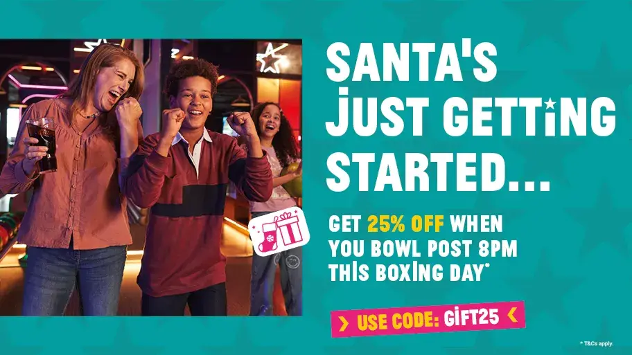 Save 25%* off standard bowling games this Boxing Day when you bowl aftet 8:00pm. Just pop in code GIFT25 at checkout and let the merry moments roll.