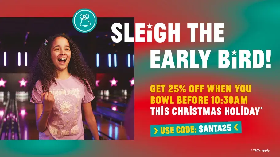 Start your day with a little festive magic and save 25% off standard bowling games during the Christmas holidays when you book to bowl before 10:30am. Just pop in code SANTA25 at checkout and let the merry moments roll.