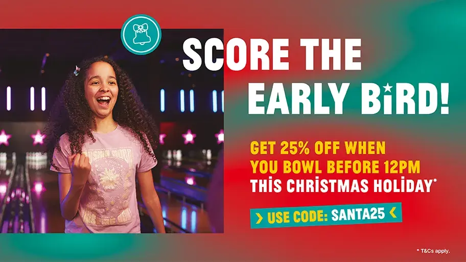 Start your day with a little festive magic and save 25%* off standard bowling games during the Christmas holidays when you book to bowl before 12.00pm. Just pop in code SANTA25 at checkout and let the merry moments roll.