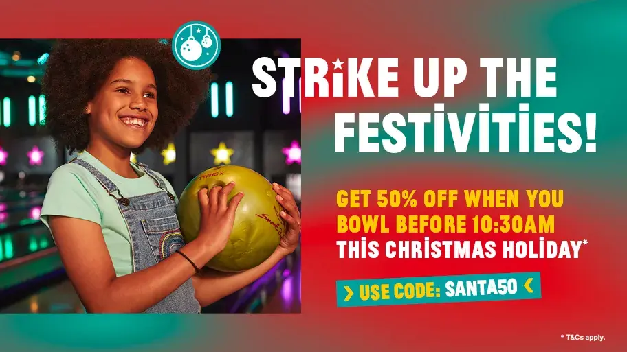 Start your day with a little festive magic and save 50%* off standard bowling games during the Christmas holidays when you book to bowl before 10:30am. Just pop in code SANTA50 at checkout and let the merry moments roll.